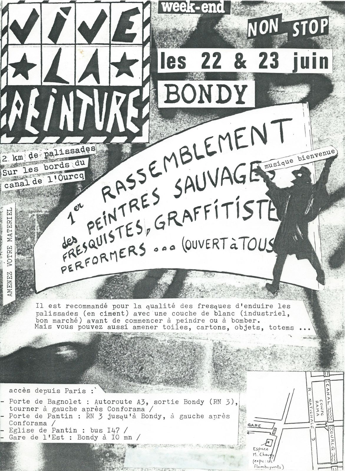 Dans cette dynamique, ils jouent les fédérateurs et réunissent leurs amis graffitistes. Ils les invitent à Bondy. Là, sur des kilomètres, les murs et les ponts du canal de l’Ourcq deviennent les cimaises de ces « flamboyants» qui y dessinent et peignent à cœur joie. Premier rassemblement du mouvement graffiti en 1985. En compagnie de Speedy Graphito, Epsylon Point, Blek le rat, Futura 2000, Nuklé Art, SP 38… Rencontre aussi avec Keith Haring à son Pop Shop de New York et avec Basquiat chez Yvon Lambert.