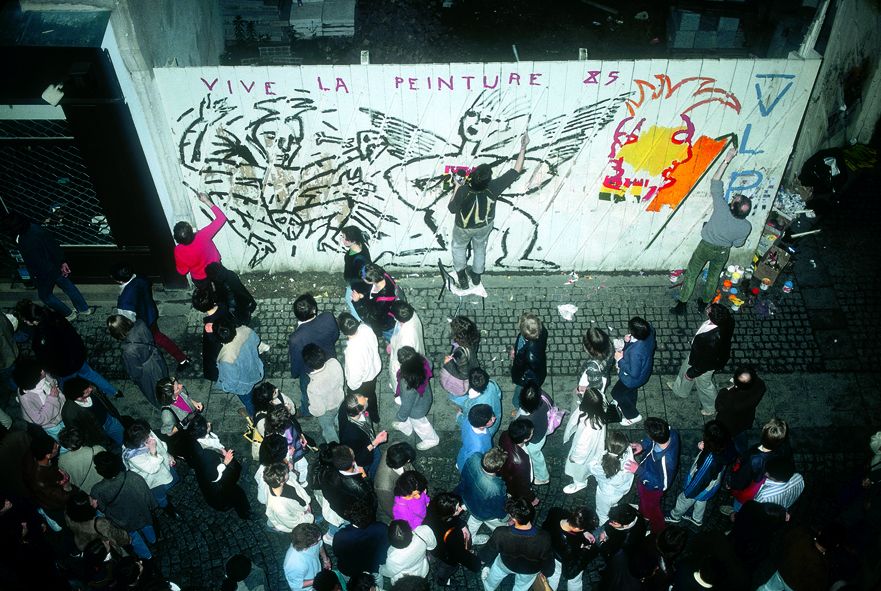 1983, c’est le déclic. Au moment où l’art conceptuel triomphe, Michel et Jean optent pour l’authenticité du geste pictural et c’est dans les catacombes de Paris, haut-lieu de l’underground de l’époque, qu’ils se rencontrent. Là qu’ils peignent au pinceau, avec leurs doigts, avec une bombe aérosol. Ils réalisent des fresques communes, les signent Vive La Peinture. Comme un mot d’ordre qui se transformera vite en logo. VLP est né. Avec spontanéité, énergie, générosité. En reniant aussi l’ego de l’artiste au profit de la synergie de groupe.