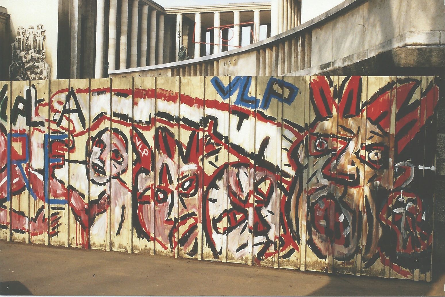 Puis, du sous-sol, ils remontent dans la rue. Vite fait, ils vont lui donner un petit air de liberté et de gaité. Car c’est maintenant aux palissades des chantiers qu’ils s’attaquent. Les « sovaj de vil atak for Bobour », les Halles, le Musée du Louvre et le MAM. Ils collent des peintures originales dans le métro et leurs « cent coups de tête » sur les murs. A la galerie Diagonale, ils peignent une palissade qu’ils découpent à la tronçonneuse et distribuent en morceaux.